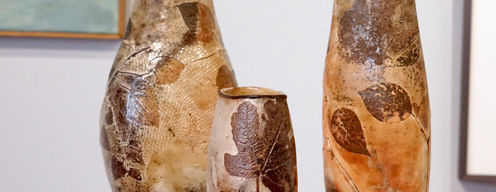 Wood fire ceramicist Loren Scherbak displays a variety of pottery vessels, relief wall plaques, and plates that incorporate local flora in their surfaces. Her experience as a printmaker helps Loren create pieces with strong, natural designs. Over more than 45 years as a potter, Loren has developed a unique glazing method resulting from the ash deposits produced in firing in her own backyard kin.