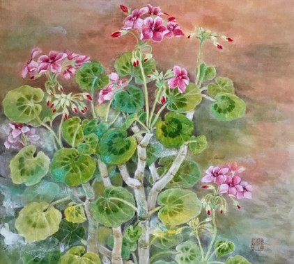 Using oriental mineral pigments on Korean mulberry paper, Mihae layers many light washes of paint to create subtle depth and variation of color.