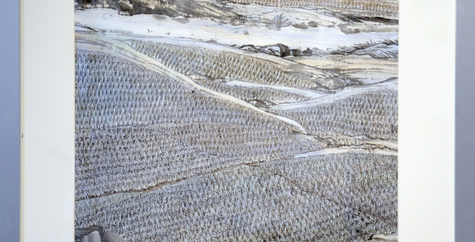 In watercolors, Yang Deling’s sketchy, freehand painting method is deeply textural, fully presenting the transparent and bright airiness of watercolors that dissolves the objects before our eyes into something real yet illusory. The mountain scenery in Yu Yuanquan’s paintings resounds with a natural charm and a carefree and otherworldly feeling that is just like flying through the clouds over a mountain range. Luo Chunping’s work does not have a specific source; she obviously draw away the visual images from real life, capturing the fortuitous effects of the intermingling of water and color with a casual freedom but leaving the viewer with space for imagination. Finally, we have to discuss He Xiaochun’s art; she is the artist in the group with the most conceptual tendencies. In the two-dimensional works presented in this exhibition, she uses mixed media, including incense ash, to convey a homesick sentimentality that floats in the paintings like a dream. Incense ash is a material she has always used to commemorate reverence and grief for departed ancestors.